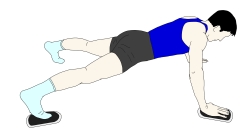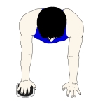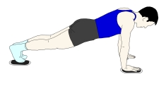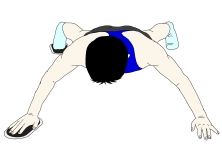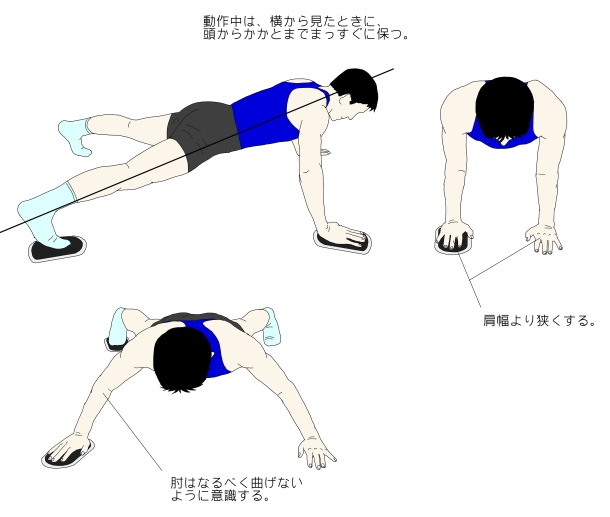 ・片方の手および足(イラストでは右側)の下にスライダーを置き、頭からかかとまでまっすぐに保つ。 ・腕の幅は肩幅、またはそれよりも狭くしていく。 |