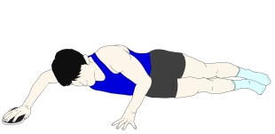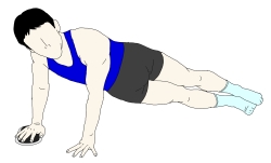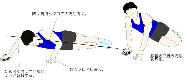 「サイドプランク」の状態から肘をなるべく曲げないで体をフロアの方に近づけていく運動になります。スライダーを用いていない方の手はフロアに着いて体を補助してあげましょう。