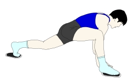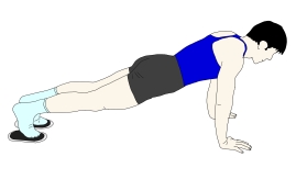 ・それぞれの足の下にスライダーを置き、手の幅が頭からかかとまではまっすぐにする。特にお尻が落ちないように注意する。 ・足のスタンスはぴったりとくっつけるか、またはこぶし1つ分くらいを目安にする。 ・手の幅は、通常のプッシュアップの幅か、場合によっては、そよりも狭いほうがやり易いと思われる。 |