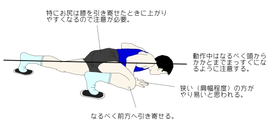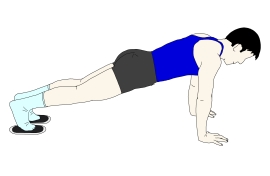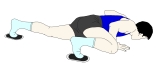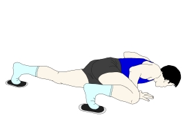 ・それぞれの足の下にスライダーを置き、手の幅が肩幅程度(または気持ち狭い)のプッシュアップポジションを取る。 ・頭からかかとまではまっすぐにする。特にお尻が落ちないように注意する。 ・足のスタンスはぴったりとくっつけるか、またはこぶし1つ分くらいを目安にする。 |