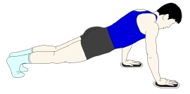 ・それぞれの手の下にスライダーを置き、左右の手の位置をずらしたプッシュアップポジションを取る。 ・頭からかかとまでまっすぐに保つ。 ・手の幅は、恐らく通常のプッシュアップの幅(肩幅よりも少し広め)がやり易いと思われる。 |