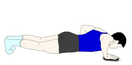 ・頭からかかとまでまっすぐに保ちながら、肘を曲げ胸をフロアの方に近づけていく。 ・帰りも、姿勢をしっかりと保ちながら肘を伸ばしていき、スタートのポジションに戻ったところで左右の手の位置を入れ替える。 ・胸をどれくらいフロアに近づけるかで運動強度の調節が可能だし、膝をついた形で運動強度を落とすこともできる。 |