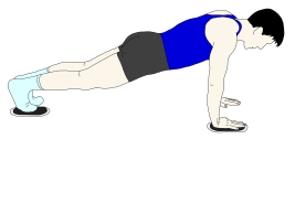 ・スライダーに置いた手と足を、なるべく肘と膝の関節を曲げないようにして横にスライドをさせ、 それぞれのスライダーが触れるくらい近づけていく。 ・スライドさせきったところから、体幹部の筋肉をしっかりと引き締めて元のプッシュアップポジションに戻していく。 |