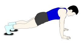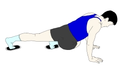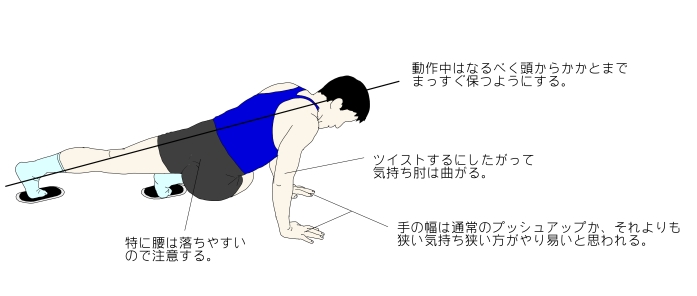 ・頭からかかとまではまっすぐにする。特にお尻が落ちないように注意する。 ・足のスタンスはぴったりとくっつけるか、またはこぶし1つ分くらいを目安にする。 ・手の幅は通常のプッシュアップの幅か、場合によってはそよりも狭いほうがやり易いと思われる。 |