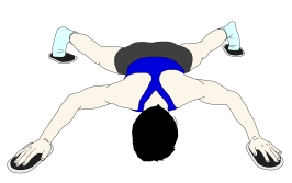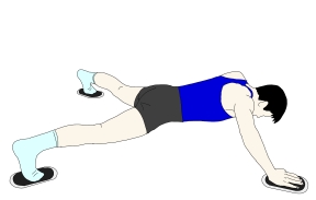 ・それぞれの手と足の下にスライダーを置き、幅を広く取ったプッシュアップポジションを取る。 ・頭からお尻まではまっすぐに保ち、腰が落ちないように注意する。 |