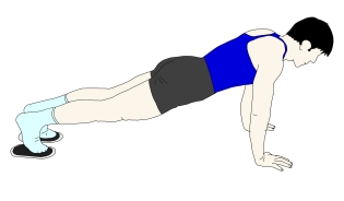 ・頭からかかとまではまっすぐにする。特にお尻が落ちないように注意する。 ・足のスタンスはぴったりとくっつけるか、またはこぶし1つ分くらいを目安にする。 ・手の幅は、通常のプッシュアップの幅か、場合によっては、そよりも狭いほうがやり易いと思われる。 |