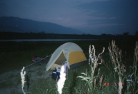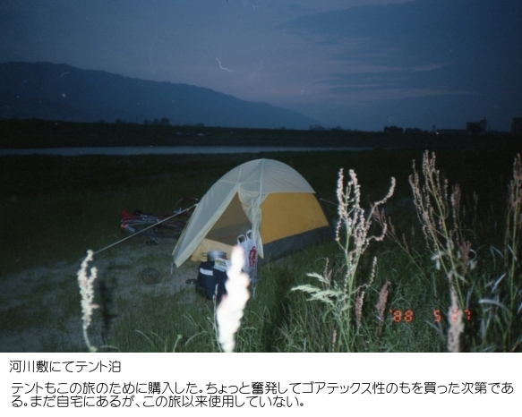 さて、今回の旅では1人用のテントを携行している。ちょっと記憶も曖昧なのだが、今までテントを張った写真がなかったということは、ここにきて初めて利用したようである。河川敷でのテント泊となった。周りには恐らく犬と思われる足趾などもたくさん残されていて「野良犬に襲われはしないだろうな?」などといろいろと考えてそう眠れるものではない。どうしても「何とか早く寝よう」と黄金色の液体の睡眠薬の量が増えてしまう。