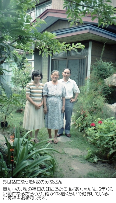 私の祖父母は男2人、女3人の計5人の子供を育てた。私の父親は二男に当たるが、長男は戦死している。女3人のうち長女は大阪で結婚をし、それ以来生活はずっと大阪である。(今回の旅でもお世話になっている)