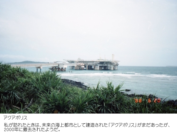 1975年に開催された沖縄国際海洋博覧会の跡地が国営沖縄海洋博覧会記念公園として整備され、その一角にある水族館がある。2005年にアメリカのジョージア水族館が開館されるまでは世界最大の水族館だったようだ。那覇市からの約90km離れたところにある。