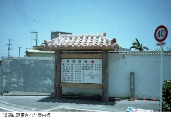 「糸満市米須霊域は、平和祈念公園から2.5kmほど南西の糸満市米須(こめす)にある霊域である。域内には、各都道県の慰霊碑や、有川中将以下将兵自決の壕・慰霊塔などがある。また、中心にある「魂魄の塔」(こんぱくのとう)は、沖縄戦に関連して沖縄各地に存在する慰霊塔のうち最古のものとされている。霊域西側には、1993年(平成5年)の第44回全国植樹祭の会場となった沖縄県平和創造の森公園が広がる。」