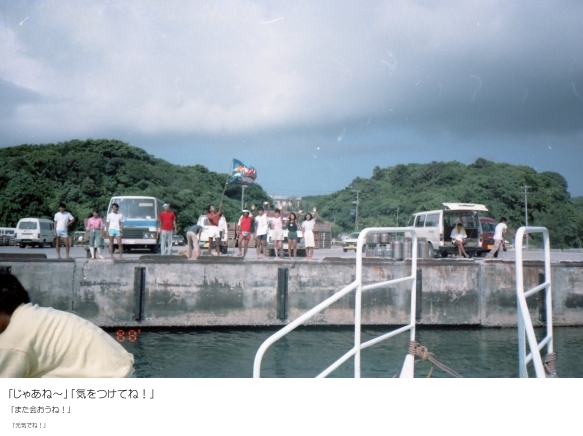 当時のいるもて荘では 「見送りダイブ」というのがあった。つまり、「行ってらっしゃい!」とか「元気でね!」と言って、見送ってくれる人が港の海に飛び込むのである。もちろん「やりたい人」だけで、全員ではない。