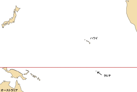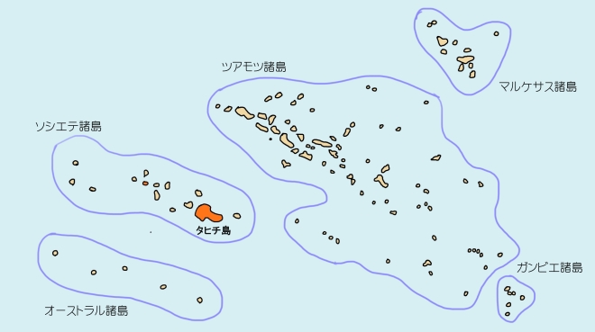さて、ここでちょっとタヒチについての基本情報を記したいと思う。タヒチは、いわゆるタヒチ島という島の名前になる。フランス領ポリネシアになるのだが、フランス領ポリネシアには、ソシエテ諸島、マルキーズ諸島、トゥアモトゥ諸島、トゥブアイ諸島、そしてバンビエ諸島の5つの諸島があり、タヒチはソシエテ諸島の中の一番大きな島で、フランス領ポリネシアの中心となる。そして、島の中で一番大きな町がパペーテであり、国際空港もそこにある。