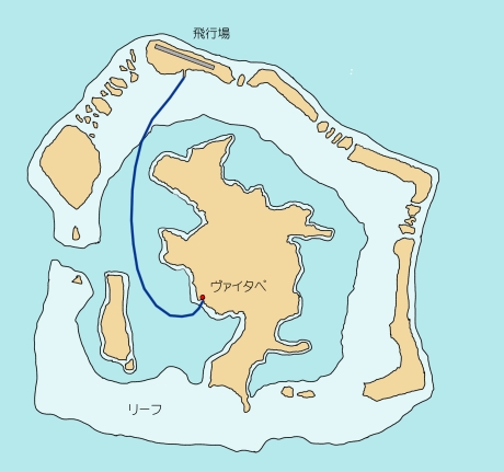 ボラボラ島の中心は1周が30キロほどの本島で、その周りをリーフ(岩礁)が囲む形になっている。また、そのリーフに沿って小さな島(モツ)が点在している。飛行場は、本島の北に位置するモツ・ムテにあり、そこから本島のヴァイタペへはシャトルボートが行き来している。また、高級リゾートホテルに宿泊する場合は、そのリゾートホテルから直接出迎えのボートなどがあるようだが、そのようなものには無縁の私は、飛行機から降りるとすぐにシャトルボートに乗り込み本島のヴァイタペに移動した。