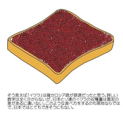 トーストしていない日本でもよく見かける四角形のパンなのだが、これにバターを塗り、その上にたっぷりとイクラを乗せていくのである。「現地の人はイクラのこんな食べ方をするんだ!」と驚きながら頬張ったが、これがなんとも美味なのであった。