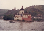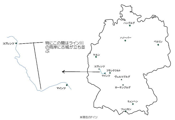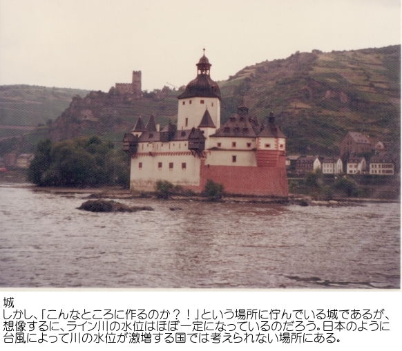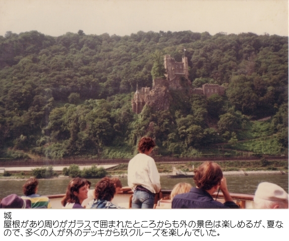 この間のライン川の両岸はほとんどが小高い丘となっており、その中腹や頂上に古城が点在し、多くの場合、その周りはワイン用のブドウ畑となっている。