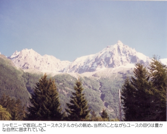 シャモニーはヨーロッパアルプスの最高峰のモンブランの麓の町で、登山とスキーのリゾート地で世界中から観光客が集まるところ。この町でも私はユースホステルを利用した。そこで一人の日本人に会ったわけだが、彼はスペインで荷物を全て盗まれてしまったが、パスポートやお金は無事だったので何とか旅行は続けられているということであった。