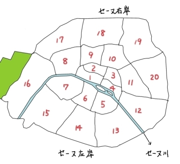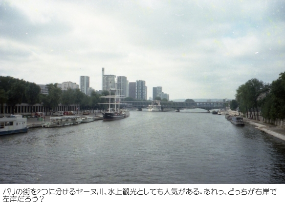 パリの街はセーヌ川によって2分されている。地図上、上に当たる北側が「セーヌ右岸」、下に当たる南側が「セーヌ左岸」となる。