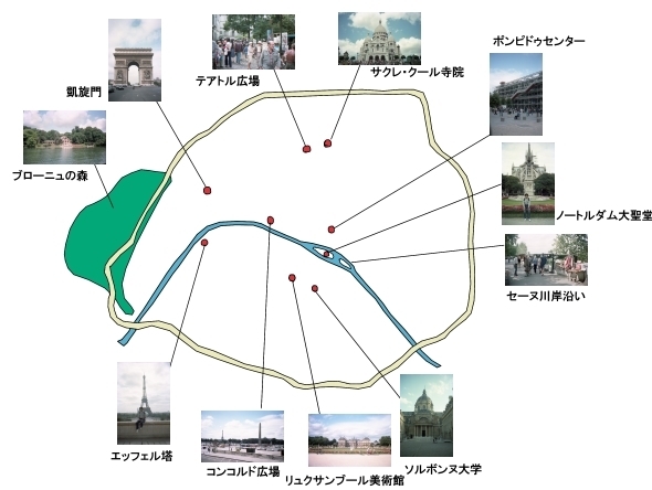 ライン川沿い、ブローニュの森、ポンピドゥーセンターなど。