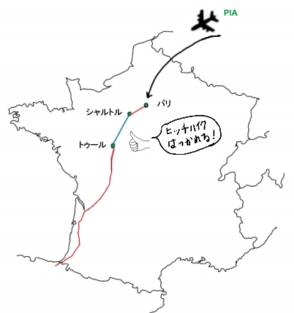 「シャルトルからトゥールへはヒッチハイクをする。行き先を紙に書き、それを持って道端に立つ。10時30分、ヒッチハイク開始。11時30分、まだ1台も停まってくれない。「よし、12時までに1台も停まってくれなかったら止めよう」と決心。11時58分、1台の車が停まってくれた。シャルトルからトゥールまで車を2台乗り継いで到着」