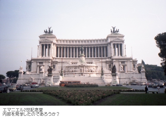 「イタリア・ローマのヴェネツィア広場に面しカンピドリオを背にして建つ、1870年のイタリア統一の立役者、初代国王ヴィットーリオ・エマヌエーレ2世の偉業を称えて建てられた記念堂」