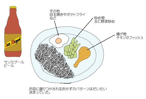 ユースホステルでは食事は提供していなかったが、恐らくマニラのユースホステルだと思うのだが、通りに面した入口にはカウンター式の食堂があって、食べる分にはわざわざ他の場所を探す必要はなかった。大きめの皿の半分くらいにライスが盛りつけられ、おかずは、惣菜屋で惣菜を購入するように、ガラスケースの中にある惣菜が盛られた大皿から好きなものを2,3種類選んで、お皿に盛ってもらった。