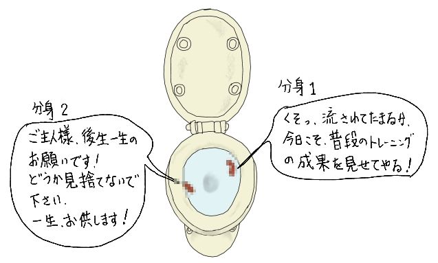 すると、「ご主人様、見捨てないでください!」と懇願するものや、「流されてたまるか!」と、「ド根性ガエル」化するものの叫びが聞こえてきたりするのである。私は、とてもじゃないが、そういう彼らの悲惨な状況は直視できず、受け入れることはできなかった。よって、そう言う場合は、「みんな、ゴメン!」と言って、速攻でその場を立ち去ることにした。