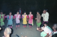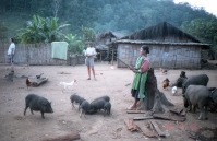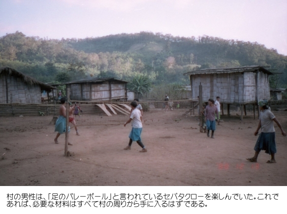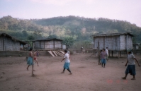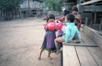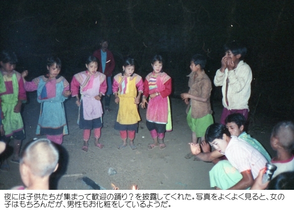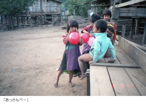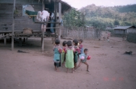 それから2時間も歩いたであろうか、子供たちの声が聞こえてきたかなと思っていると、急に目の前が開け、目的地の村に到着した。すると、今まで飛びまわって遊んでいた子供たちは、私たちの到着に気が付くと、みんな私たちの方に駆け寄ってきた。一番先頭を歩いていたガイドが、自分が背負っていたデイパックからお菓子や風船などを取り出して子供たちに渡すと、子どもたちは再び「キャーキャー」と声を上げながら、もらった風船などを膨らまして遊び始めた。もうここまで来ると、私たちの宿泊予定の小屋は目と鼻の先であった。