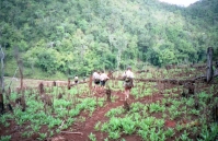 昼を過ぎたあたりだろうか、前日同様、丘を超えるように歩いていたが、前方を覆う木々も少なくなり目の前が少しずつ開けていった。そして、ある丘の頂上に来た時に360°見渡せるようなところに出た。よくよく周りを見回すと、そこはケシが栽培される畑になっていた。ただ、残念なことに、花は結実を終え、その実はほとんど収穫された後であった。従って、畑には実が収穫された後のケシの葉と、「何で今頃咲いてきたの?」と聞きたくなるほど、遅咲きの花がポツンポツンとある程度であった。